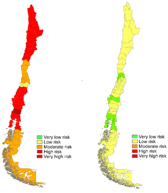 The results for energy efficiency indicate low risks in O’Higgins, while high-risk levels were found in the south and far north (Figure 5, left). In southern Chile, the reliance on biomass for heating elevates risk due to its low system efficiency (η = 0.62), contrasting with regions using liquefied gas, where efficiency is higher (η = 0.9). The O’Higgins region is relatively low-risk since liquefied gas is the main fuel for heating, cooking, and hot water systems, leading to greater overall energy efficiency.