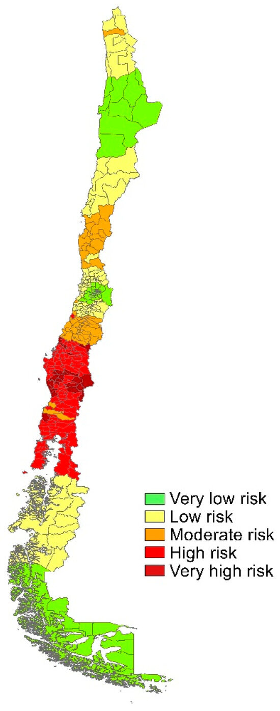 The Bío-Bío and La Araucanía regions have a greater number of hours without electricity service supply (SAIDI) (Figure 4). An explanation for this could be falling trees on the power grid due to high wind speeds, especially in the winter: in the La Araucanía region, for example, 21.2% of the surface corresponds to forest plantations located mainly in the mountain range (east) and the coastal area (west) and these areas also observe the highest wind speeds. For the appropriateness of household fuels for health, firewood (which is most detrimental to health) is most predominantly used in the center and south of Chile, which leads to increased risk in these regions.