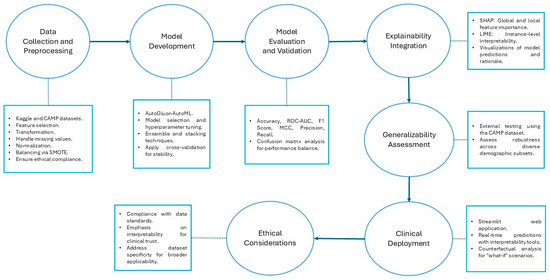Figure 1 illustrates the complete workflow of the methodology employed in this study, from data collection and preprocessing to model deployment and interpretability integration. Each phase is aligned with the study’s goal of creating an interpretable and generalizable asthma outcome prediction model.