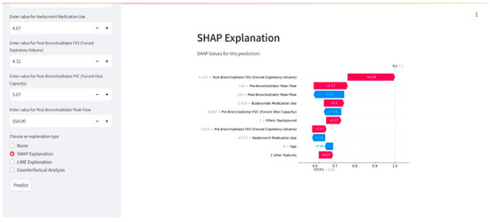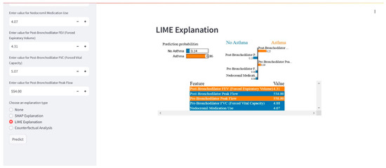 Explainable AI techniques, such as SHAP and LIME, significantly enhanced the transparency of the model’s predictions. Key features identified through SHAP analysis, such as age, Budesonide dosage, and pulmonary function metrics (PREFVC, POSFEV), align with known clinical predictors of asthma exacerbation [20,21].