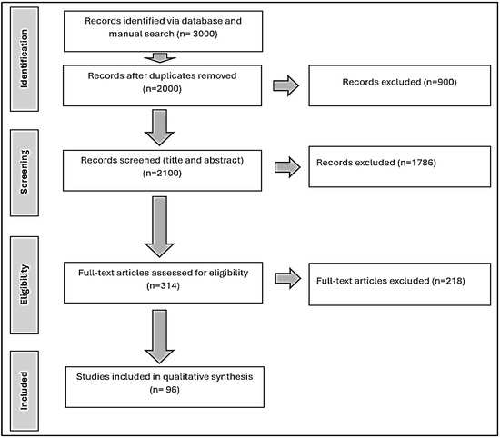 The diagram (Figure 1) above visually summarizes the screening process of the review, which initially records the number of articles found and then makes the selection process transparent by reporting on decisions made at various stages of the systematic review. The total number of all screened, included and excluded articles is demonstrated in Figure 1 to show how the data were extracted for synthesis. Researchers’ disagreements and conclusions were confirmed by examining the data’s correctness, consistency, and applicability. The paper’s conclusions were supported by a survey of the literature.