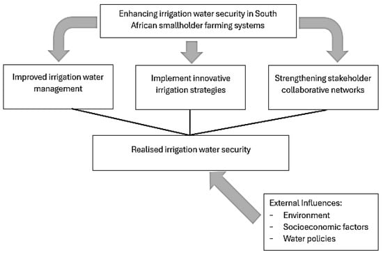 The study’s conceptual framework (Figure 1) is designed to guide the exploration and evaluation of strategies for improving irrigation water security among South African smallholder farmers. Thus, the framework (Figure 1) highlights the relationship between innovative strategies aimed at improving water security, collaborative networks among stakeholders, and the specific challenges confronted by South African smallholder farming systems. The framework as illustrated in Figure 1 below, further recognizes the influence of the broader environmental, socioeconomic, and policy factors that shape water security in rural agricultural contexts.
