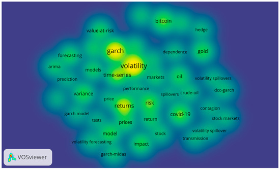 Finally, Figure 3 displays the keywords that were most frequently mentioned in the analyzed publications, using density visualization. The larger the area surrounding a keyword, the more extensive its reach. GARCH, volatility, and returns are among the most discussed keywords.