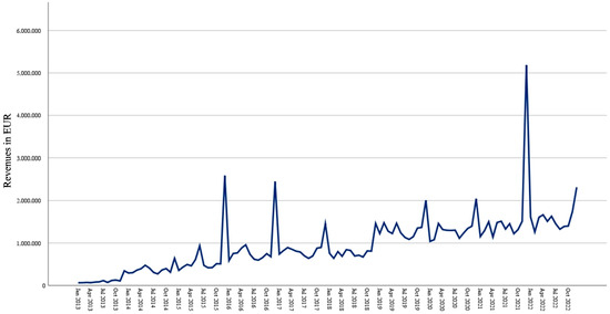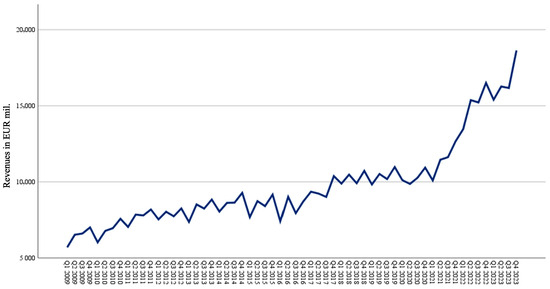 Figure 4 shows the development of revenues in the sector from the first quarter of 2009 to the fourth quarter of 2023. The time series is non-stationary (as verified by the KPSS test) and exhibits a trend. The seasonal fluctuations show a significant dependence on the trend, with a maximum in the fourth quarter and a minimum in the first quarter. Revenues initially show a slightly increasing trend, followed by stagnation between 2017 and 2020, and then a marked increase starting in 2021.