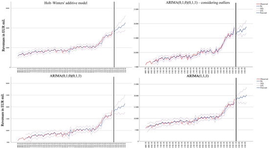 In this section, we provide time series analyses of revenues for the SK NACE section G sector—wholesale and retail trade, repair of motor vehicles and motorcycles. Both ARIMA and exponential smoothing models were applied.