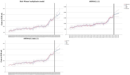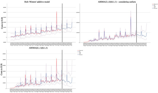 IBM SPSS Statistics software automatically selected model parameters, including smoothing levels for Holt–Winters’ method and the parameters (p, d, q) for ARIMA. These values were subsequently manually verified and fine-tuned by analyzing the outputs and evaluating the models’ fit to the data. For this purpose, additional analytical techniques, such as residual visualization and model quality tests, were applied to ensure the reliability and accuracy of the predictions.