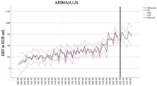 Although more advanced and accurate techniques, such as generalized autoregressive conditional heteroscedasticity (GARCH) models for volatility modeling or machine learning methods, exist, their implementation requires large amounts of data and complex settings that are not always necessary for forecasting financial indicators with relatively stable behavior. In our analysis, we chose exponential smoothing and ARIMA models because of their ease of application and ability to provide interpretable results, making them ideal for strategic decision-making at the managerial level [3,18]. These models are sufficient for our purposes; in the future, we plan to extend our analysis using more advanced methods if the need arises to work with data exhibiting higher volatility or non-standard patterns of behavior.