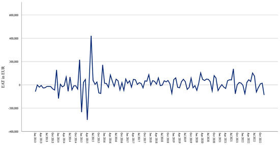 Skewness indicates the degree of asymmetry in the data distribution—positive values suggest a rightward skew, where data points are more concentrated at lower levels, while negative values indicate a leftward skew. Kurtosis measures the presence of extreme values compared to a normal distribution—values greater than three may indicate a higher frequency of outliers, which can influence the choice of predictive models. A comparison of the monthly data for the company and the quarterly data for the sector highlights differences in the variability ranges of individual indicators, as well as distinct dynamics in the time series. Notable disparities, such as in the variability of EAT and EBT, reflect differences in structure and cyclical influences between the business entity and the sector. The time series data span from the first quarter of 2009 to the fourth quarter of 2023 for the sector, and from January 2013 to December 2022 for the company, providing a sufficiently broad foundation for identifying long-term trends, seasonal effects, and potential anomalies.