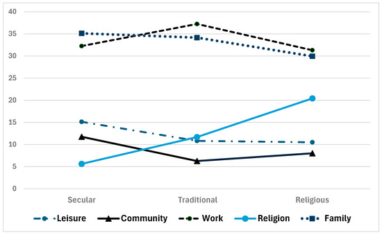 William and Mason [72] pointed out that according to Islamic tradition, various forms of leisure activities lie in the area between acceptable “Halal” (e.g., sports, vacations) and unacceptable “Haram” (e.g., drinking alcohol, gambling). The acceptable leisure activities of Muslim religious women are restricted compared to those of their traditional and especially secular counterparts because they must take place under gender segregation, wearing the “hijab” (headscarf) [71]. Furthermore, they are under patriarchal control and expected to be devoted to the family; therefore, their leisure activities are minimal [45,72]. According to Schwartz [22], leisure time activities serve more the need for change and individualism than conformity and conservation. Therefore, in religious communities, women are expected to be less interested in leisure time activities, which can come into conflict with their conservative outlook. Based on the above findings, the following hypothesis was formulated: