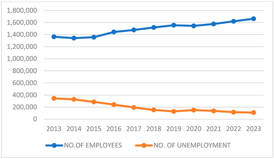 Table 2 shows that the number of employed persons has been constantly increasing from 2013 until 2023; the number of unemployed persons has also been constantly decreasing until 2019, increased in 2020 due to the COVID-19 pandemic, and then decreased again until 2023. The number of immigrants has constantly increased yearly, with the most significant jumps occurring in 2018 and 2022. The number of emigrants increased until 2017 and has since stabilized at around 40 thousand per year, and the net salary has constantly increased by approx. 4–5%. The Figure 1 analyzes employment and unemployment in the observed period.