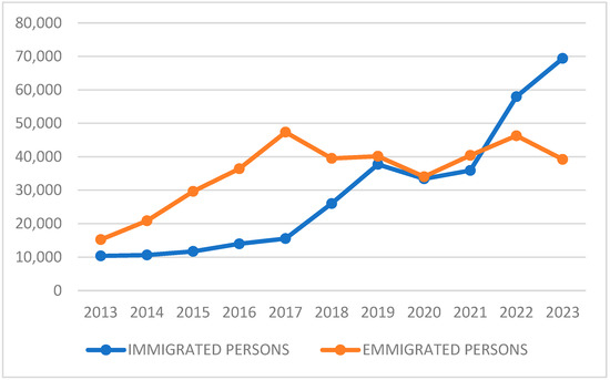 Immigrated and emigrated persons—Croatia, 2013–2023. Source: The Ministry of the Interior, Statistics. Retrieved from: https://mup.gov.hr/statistika-228/228 (Accessed between August and September 2024).