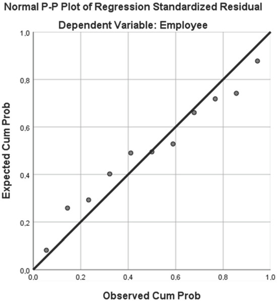 Table 7 presents the coefficients for the regression model, highlighting the unstandardized and standardized coefficients for each predictor. The analysis reveals that technology (B = 74,704.654, p = 0.034) and foreign workers (B = 742,565, p = 0.027) have a statistically significant impact on the dependent variable, with positive standardized beta coefficients of 0.597 and 0.385, respectively. The education and skill factor also shows a positive relationship (B = 35,889.954). However, it is not statistically significant (p = 0.146), and the tolerance and VIF values indicate no serious multicollinearity issues within the model.