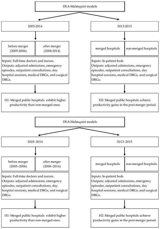 The research is structured around two distinct periods and hypotheses, both assessed through DEA–Malmquist models. On the left side, the 2005–2014 model (H2) adopts a longitudinal perspective, comparing productivity before (2005–2006) and after (2008–2014) the creation of hospital centers. This allows the evaluation of long-term productivity trends resulting from mergers. On the right side, the 2013–2015 model (H1) adopts a cross-sectional approach comparing merged and non-merged hospitals in the short term.