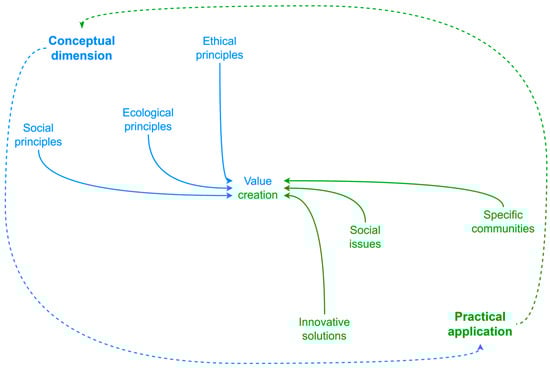 In this regard, SE has made considerable progress in its understanding and application within both academic and business fields. This type of entrepreneurship cannot be understood solely from a conceptual perspective. While social and ecological components are central to its structure, its core essence lies in translating these values into concrete, context-specific actions. Figure 1 illustrates the two-dimensional relationship of SE, integrating values and principles that guide its purpose so they can be translated into practical application.