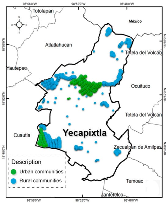 Yecapixtla is a municipality located in the northeast of the state of Morelos, Mexico, with a territorial area of 173.2 km2 and an altitude ranging between 1300 and 2200 metres above sea level (Figure 3). Its population amounts to 56,083 inhabitants, with a growth of 19.8% over the last decade [36], and a projection indicating a sustained upward trend towards 2030 [37]. The local economy is mainly based on commerce (47.25%), services (34.91%), and manufacturing (17.19%) [38], with a total of 2309 registered economic units. The economically active population represents 67% of inhabitants over the age of 12 [39].