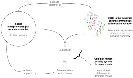 In addition, this research considered the SDGs within the dynamics of rural communities with a tourism vocation, allowing for the structuring of a critical discourse on the desirable and feasible changes within the system. Figure 4 illustrates the application of SSM in this context, detailing the study procedure for the implementation of solutions.