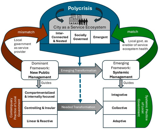 Local governments are increasingly navigating accelerating change and escalating complexity caused by interconnected crises, commonly referred to as a global polycrisis. These crises, including climate change, lack of affordable housing, declining mental health, and geopolitical instability, both shape and are shaped by local conditions. Cities face growing pressure to equitably provide services that are responsive to evolving community needs while contending with the systemic nature of contemporary challenges. However, local governments are often constrained by conventional management frameworks and practices that do not match the complexity of today’s challenges. The purpose of this conceptual paper is to explore how systems science can be leveraged to define and characterize a transformative new type of management designed to enable local governments to more adequately address emerging complexity. To this end, the authors review the literature on contemporary management practice and explore how management for local government can be reframed in alignment with the insights from systems science, using a service ecosystem lens. The findings point to a needed shift toward systemic management practices that are integrative, collective, and adaptive. The authors illustrate the practical relevance of these three characteristics and conclude with recommendations for research, policy, and practice aimed at building the institutional capabilities required to transition toward systemic management frameworks and practices that match the complexity of the polycrisis.