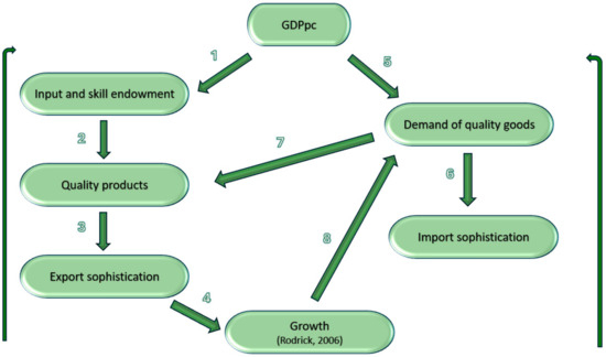 The right-hand side of the figure indicates that the per capita GDP level influences a country’s demand of goods, as richer consumers demand innovative, high-quality, varied, and, in one-word, sophisticated goods [27,32]. This demand, in turn, also drives sophisticated imports [27,33,34].