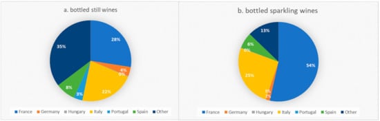 The EU Member States selected for our analysis represent almost 65% of world exports of still bottled wine and slightly less than 90% of world exports of bottled sparkling wine. Hence, countries not considered in this analysis (other European producers and all non-EU countries) cover 36% of total exports of still bottled wine and only around 12% of sparkling wine exports. Among the focus countries, the group leaders are France and Italy, with them both leading the still bottled wine market, together covering almost 50% of the market, and France dominating the sparkling wine world market (Figure 2a,b).