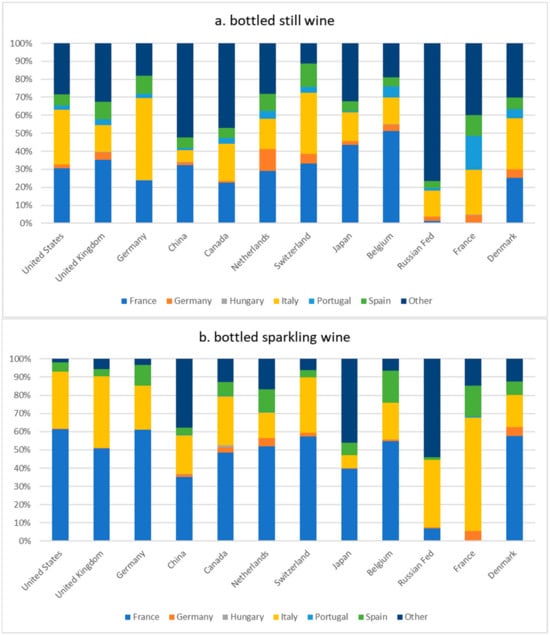 The six European wine exporters on which our analysis focused represent traditional and stable wine exporters. As such, they collectively make up the world leaders of the industry, contributing almost two-thirds of world trade for still wine and an even larger share for sparkling wine. Some of them, especially France and Italy, hold the largest shares of the most important world importers, even if this does not apply to large and relevant importers such as Russia and China [4,40]. However, with new non-EU exporters increasing in prominence, their shares have reduced and competition within as well as outside the group has become more intense [41].