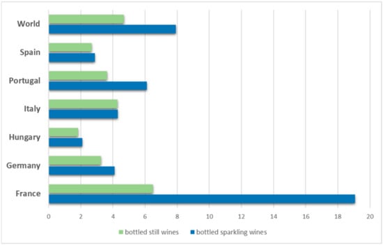 Lombardi et al. [15] analyzed the main EU wine exporters’ performance in the European market, especially in the UK and Germany, which are the most relevant European importers for both bottled wines and bulk wines. Limiting the results to the first category, the authors’ findings note the good performance of Italy and Spain in terms of quantities exported, while France’s results were quite flat over time; however, France showed a higher capacity to create value over time, so keeping a constant advantage compared to Italy and Spain. Marco-Lajara et al. [16] also confirmed the marked increase in the volume of Spanish wine exports. The increase in volumes exported by Italy and Spain has also led, over time, to an increase in their exports of bulk wine, while France, being strictly oriented toward higher market segments, never really increased its sales of this type of wine.