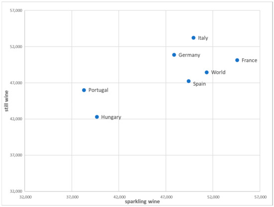 Figure 5 shows that there are two distinctive countries, Portugal and Hungary, that do not keep up with the rest of Europe and remain well below the world average; the second group, accounting for the remaining focus exporters, clearly contributes to defining the world values, with France (for sparkling wines) and Italy (for bottled wines) in the lead.