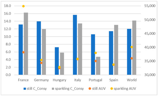 In analyzing the sophistication of the destination markets of our focus exporters (Table 2 and Figure 5), the overall high Consy values associated with bottled wines are not surprising when considering that the three major world importers for bottled still wine are the United States, the United Kingdom, and Germany, while for sparkling wine, Germany is replaced by Japan. Evidently, we are talking about reaching sophisticated markets with high income elasticity for “luxury goods”, where drinking wine is also a status symbol. It is also connected to lifestyle and the association of wine with Western diets and social behaviors [1,39,40].