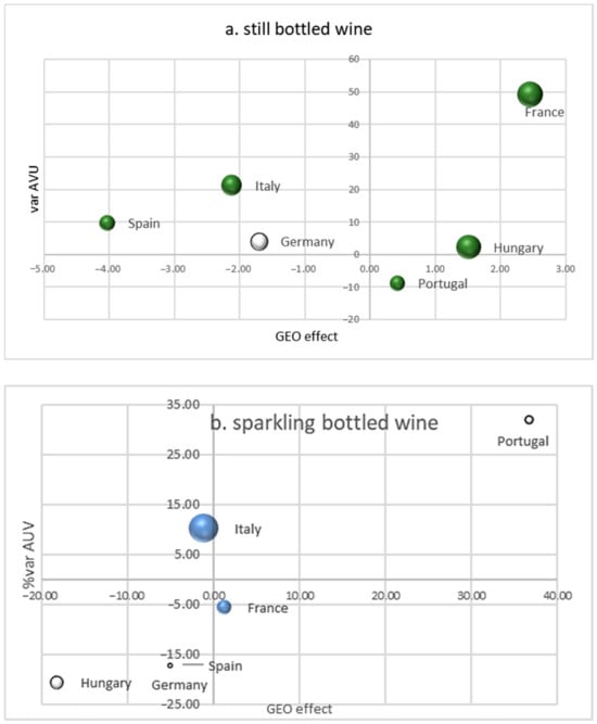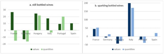 The dynamic analysis looks at the time span between 2010–2011 and 2019 and 22 and starts by looking at the changes in the wine export flows (Figure 7a,b). Regarding still wines (Figure 7a), the graph shows generalized growth, except for Germany, whose exports decline. In greater detail, Hungarian and Portuguese exports growth both in terms of value and quantity, and it seems that quantity drives the change. In contrast, France and Italy expand the values of their exports by upgrading quality and reducing quantity, while Spain manage to increase the export value and keep the quantity flow constant. The case of sparkling wines appears quite different (Figure 7b); here, the change is led by the huge increase in Italian exports, which nearly tripled in terms of both value and quantity. French sparkling wine exports also increased significantly, even if not so notably as Italian ones; Spain and Germany followed at a moderate pace, while Hungary and Portugal went backward.