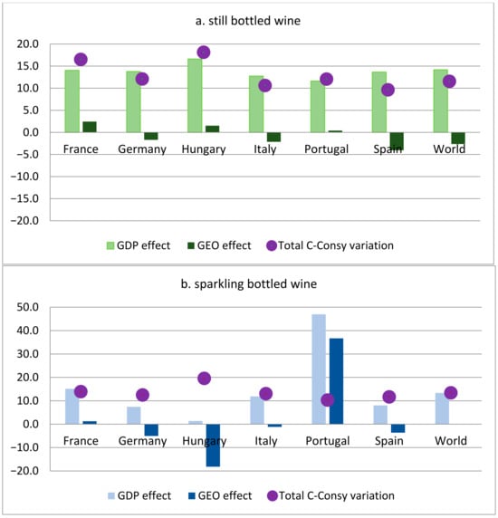 As for the C-Consy index, its variations over the decade allow us to obtain relevant insights into the different paths followed by the exporters (Table 3 and Figure 8a,b). Looking at both graphs, we see that the index always exhibits a positive trend, with the only exception of Hungary for sparkling wine. However, the magnitude of the variations differs, and is particularly large for sparkling wines. Second, we see that the GDP effect is also always positive, but smoother across countries for still wine, while it is much more varied for sparkling wine. As for the GEO effect, for both kinds of wine we observed positive as well as negative variations, and often the signs are aligned between the two wines for each exporter. Summing up, we can say that while the total C-Consy variations are mostly determined by the GDP effect, the differences in the variations among countries are mainly due to the varied GEO effect. This effect is particularly interesting in the context of our analysis because it expresses changes in the geographical directions of trade flows reflected in the average income of importers, and thus in the kind of competition met by the exported goods. Indeed, we can see that Italy, Spain, and Germany downgraded their export flows towards both relatively poorer and less sophisticated countries. On the contrary, France and Portugal managed to upgrade towards richer, more sophisticated countries (Portugal in particular saw a big jump in sparkling wine exports); finally, Hungary is the only country that exhibited contrasting tendencies, with little improvement for still wine and a substantial worsening for sparkling wine.