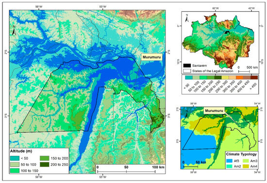 In the upper right corner, the location map shows the position of Santarém within the Brazilian Legal Amazon. This representation highlights state boundaries and regional elevation distribution, with a color gradient ranging from <50 m to >450 m, allowing for a broader physiographic context of the study area [21,22]. The lower right map presents the climate typology, based on an adapted Köppen classification [22]. Four predominant climate classes are identified in the study area: Af3 (super-humid equatorial climate), Am2, Am3, and Am4 (variations in the monsoon climate). The Murumuru territory lies in the transition zone between Af3 and Am2, reflecting the influence of contrasting pluvial regimes and the presence of both more-humid environments and areas with reduced rainfall supply, according to [23]. All maps are georeferenced using the SIRGAS 2000 geographic coordinate system.