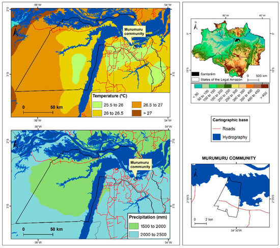 The map on the right side offers a broader regional context, situating the Murumuru Territory within the municipality of Santarém and the Brazilian Legal Amazon. It also includes infrastructure elements such as roads and hydrography, as well as a detailed locator map of the Murumuru community (bottom right), which helps illustrate the proximity to major water bodies and floodplain systems. Together, the temperature and precipitation maps demonstrate that the Murumuru community is located in a highly dynamic and sensitive socioecological zone, where the interaction between climate, hydrology, and topography shapes land use, vegetation distribution, and the viability of traditional extractive systems such as native açaí harvesting.
