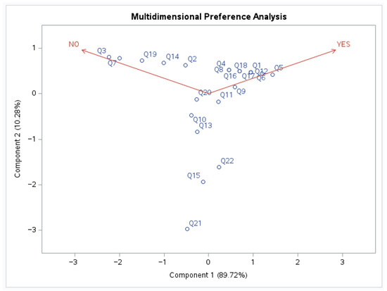 Figure 3 displays the results of the Multidimensional Preference Analysis, illustrating the distribution of responses to 22 questions (Q1 to Q22) across two principal components. Component 1 explains 89.72% of the total variance, while Component 2 accounts for 10.28%, jointly representing 100% of the variability in the data. This indicates that the two-dimensional projection fully preserves the internal structure of respondents’ preferences.