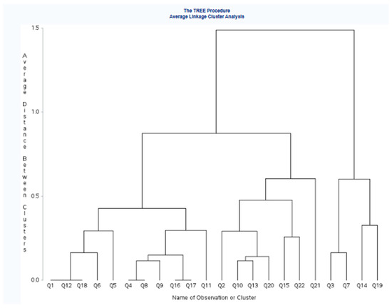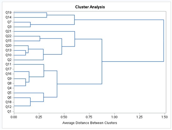 Figure 4 presents the results of the Cluster Analysis applied to the 22 questionnaire items (Q1 to Q22), displayed as a dendrogram based on the average linkage method (between-groups) and using Euclidean distance as the dissimilarity measure. The x-axis represents the average distance between clusters, while the hierarchical tree on the y-axis illustrates how items were grouped according to response similarity.