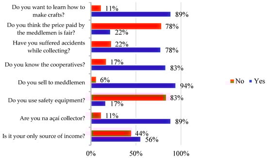Distribution of ‘Yes’ and ‘No’ Responses on Occupational and Commercial Aspects of Açaí Harvesting. Affirmative (blue) and negative (red) percentages based on responses from agro-extractivists.