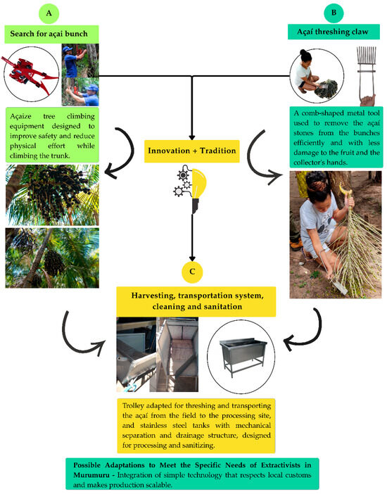 Figure 7 presents a conceptual flow of technological adaptations that combine innovation and traditional knowledge to support the açaí extraction process in the Murumuru community. The scheme is organized into three key operational components: