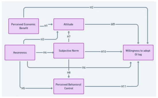 Although many studies highlight the lack of awareness about GI and its benefits among producers, there are limited studies which link this aspect to the behavioural factors and producers’ willingness to adopt GIs to examine the underlying impact. Studies such as [51] also highlight the pivotal role of awareness in driving adoption and emphasise the need to establish a direct link between producers’ awareness of GI practices and their willingness to adopt them. Therefore, we hypothesise the following.