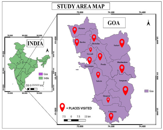This study focuses on Goa as a geographically and culturally appropriate site for investigating producer perceptions of GIs, particularly concerning Cashew Feni. By examining the interplay between awareness, attitude, perceived economic benefits, subjective norms, perceived behavioural control, and willingness to adopt and support GI-tagged products, this research aims to assess the impact of GI certification on traditional industries. Figure 2 illustrates the geographical landscape of the study area, highlighting key cashew-growing regions and Feni-producing localities, which form the socio-economic context for this investigation.
