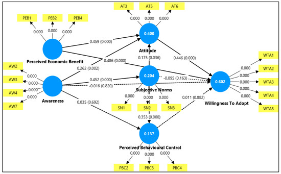 The results of the measurement model, which assessed the reliability, validity, and appropriateness of the data for subsequent Partial Least Squares–Structural Equation Modelling (PLS-SEM), are presented in Table 3. Six latent constructs—attitude awareness, willingness to adopt GI tag, subjective norms, perceived behavioural control, awareness, and perceived economic benefit—were assessed to determine the willingness to adopt the GI tag (Appendix A). Each construct was measured using multiple observed variables. During the validation of the measurement model, reliability and validity were confirmed by examining outer loadings and multicollinearity values. However, several items were found to fall below the recommended thresholds, specifically outer loadings below 0.70 and Variance Inflation Factor (VIF) values exceeding 5, indicating issues with the individual item reliability and potential multicollinearity. Therefore, due to such reasons, certain variables, such as AW1, AW5, AW6, and AW8 from the awareness construct; AT1, AT2, and AT4 from the attitude construct; SN4, SN5, and SN6 from the subjective norms construct; PBC1, PBC5, PBC6, and PBC7 from the perceived behavioural control construct; PEB3, PEB5, PEB6, and PEB7 from the perceived economic benefits construct; and WTA6, WTA7, and WTA8 from the willingness to adopt construct, were excluded from the final model. In order to ensure validity and reliability, the researchers carefully assessed the variables before deletion. This process firstly involved an initial model estimation with all items retained. This was followed by checking the outer loadings of each variable to identify those with smaller loadings (<0.7). The next step involved the one-by-one removal of indicators with low outer loadings, while carefully observing their impact on the AVE and CR. This process was repeated iteratively, and indicators whose removal improved the AVE and CR values were excluded from the final model. Thereafter, the model was re-estimated and the R2 values, path coefficients, and model fit indices were assessed.