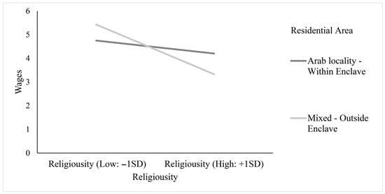 To analyze the significant interaction term, a simple slope analysis was conducted. Specifically, it was found that for those who work within their ethnic enclave there was a negative effect of religiosity on type of position (b = −0.67, se = 0.16, p < 0.001, OR = 0.51). Yet, a stronger negative effect was found for those who work outside their ethnic enclave (b = −2.10, se = 0.76, p = 0.01, OR = 0.12) (Figure 1). Specifically, these results indicate that the greater a person’s religiously, the less likely it is they will work in a full-time position and that this relationship is stronger outside the ethnic enclave than it is inside it. Regarding wages, a parallel exanimation uncovered that for those who work within their ethnic enclave, there was a negative relation between religiosity and wages (b = −0.37, se = 0.13, p = 0.004). Yet, a stronger negative effect was found for those who work outside their ethnic enclave (b = −1.25, se = 0.41, p = 0.003). The simple slopes are presented in Figure 2. Specifically, these results indicate that the greater a woman’s religiously is, the lower the salary she receives and that this relationship is stronger outside the ethnic enclave than it is inside.