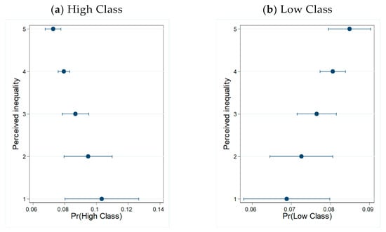 Figure 1, based on Models (2) and (3) in Table 1, illustrates the substantive magnitude of these effects. The predicted probability of identifying as high class decreases from 0.10 to 0.07, while the probability of identifying as low class rises from 0.06 to 0.08. Although the changes appear modest, they are consistent across specifications and statistically reliable, underscoring the role of perceived inequality in shaping subjective class identification.