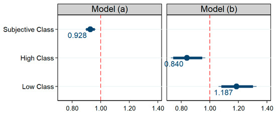 Subjective class and trust in voting (odds ratio). Note: Odds ratios from ordered logistic regressions (N = 36,360). Model (a) includes a subjective class measured on a 1–10 self-placement scale. Model (b) distinguishes high class (scores 8–10) and low class (scores 1–3). The dependent variable is distrust in elections, coded from 1 (highest trust) to 5 (lowest trust). Controls include income, education, occupation, age, sex, marital status, religiosity, urban residence, and political orientation, with country and year fixed effects. Odds ratios below 1 indicate greater trust, while those above 1 indicate greater distrust. Full results are reported in Table S8 in the Supplementary Materials.