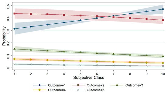 Figure 3, based on Model (a), illustrates the effect of subjective class on the probability of various trust levels in voting outcomes. The x-axis represents the subjective class, and the y-axis represents the probability of five outcomes, ranging from highly trust (=1) to highly distrust (=5). As subjective class increases from 1 to 10, the probability of highly trusting the voting process rises from 31.34% to 47.10%. Conversely, the probability of trusting declines from 43.54% to 38.22%, being neutral drops from 15.11% to 9.28%, distrusting falls from 7.12% to 3.89%, and highly distrusting decreases from 2.89% to 1.50%. These findings demonstrate that higher subjective class is strongly associated with greater trust in the electoral process.