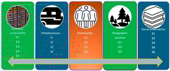 The starting factors and sub-factors influencing the rural area development in Serbia were obtained from the literature overview that is given in Section 2.1, followed by an expert discussion. The debate and consultation among the 10 experts/decision-makers from the areas of economics, rural development, construction, agriculture, and education, based on their life and more than 10 years of working experience, led to the selection of 21 sub-criteria, classified into five groups: economic sustainability (E), infrastructure and access to services (I), community participation and resource management (C), geographical location (G), and social sustainability (S).