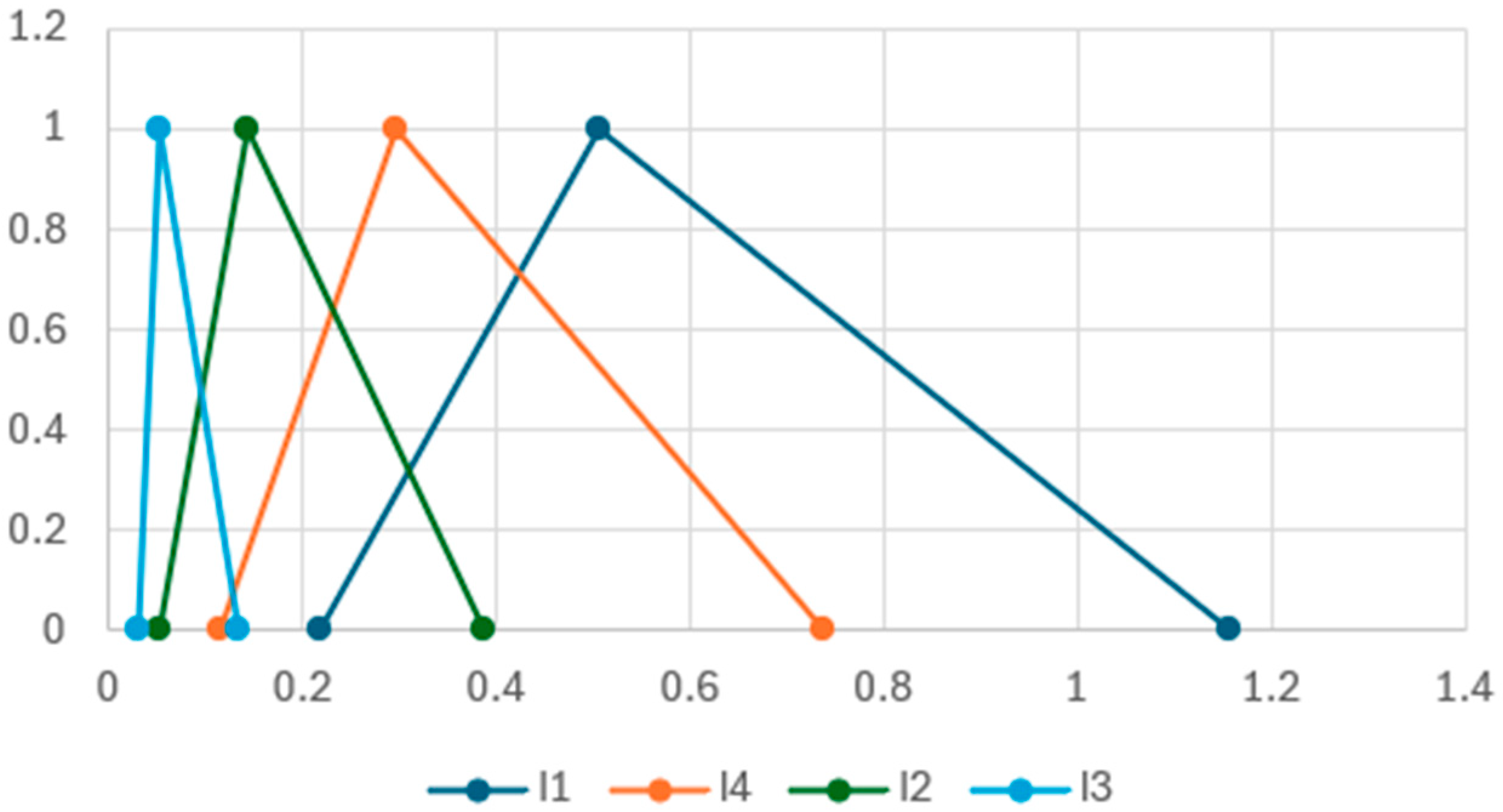 = 0.219. In the balanced FAHP case, the sub-criterion I1 has 1.66 times greater influence than I4 and 3.3 and 8.81 times greater than I2 and I3. The triangular fuzzy numbers obtained for the criteria from group I can be seen in