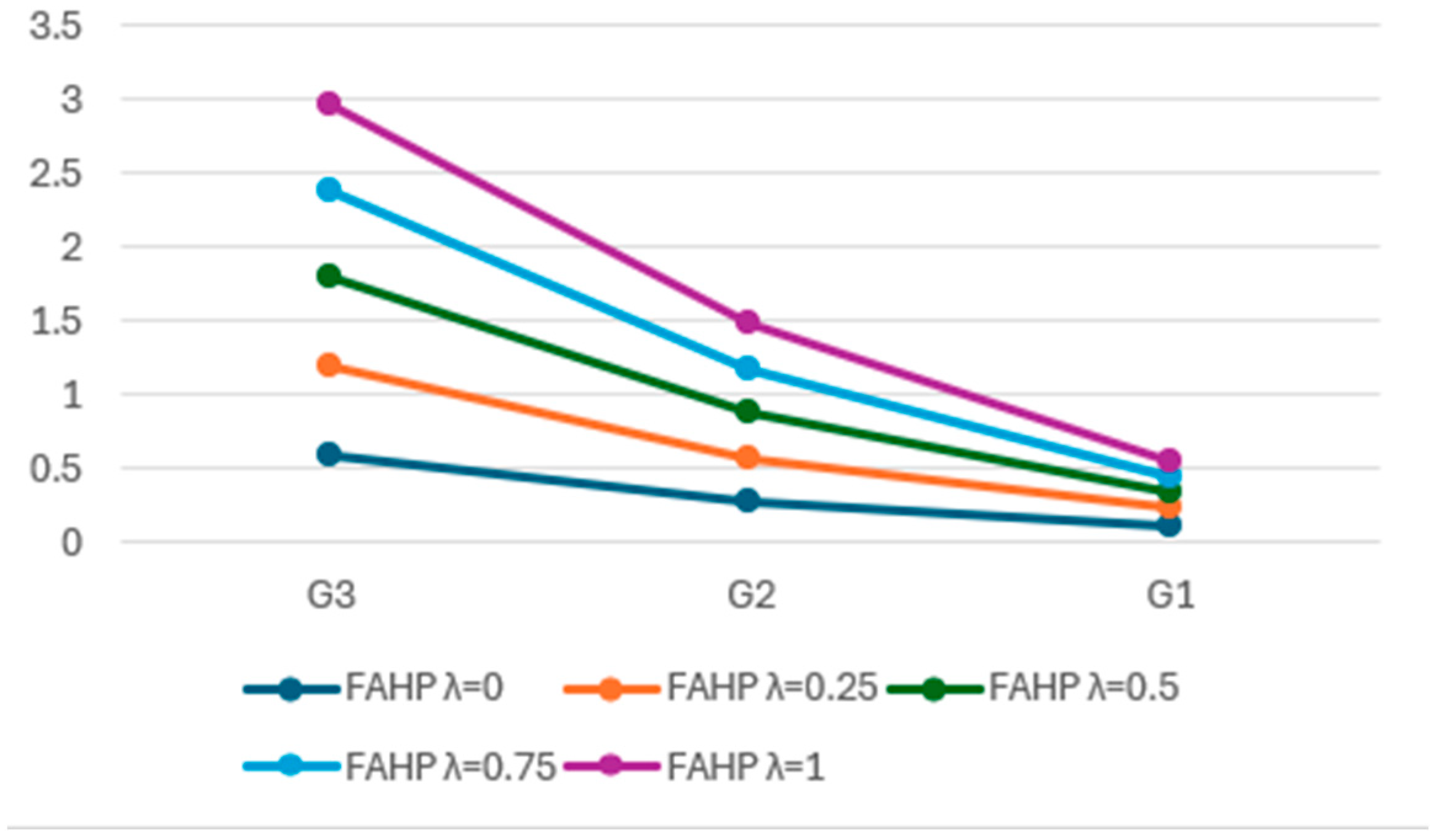 Figure 8, the highest similarity (100%) in ranking sub-criteria is obtained when comparing the semi-pessimistic FAHP with the balanced and semi-optimistic FAHP. The lowest value of the coefficient