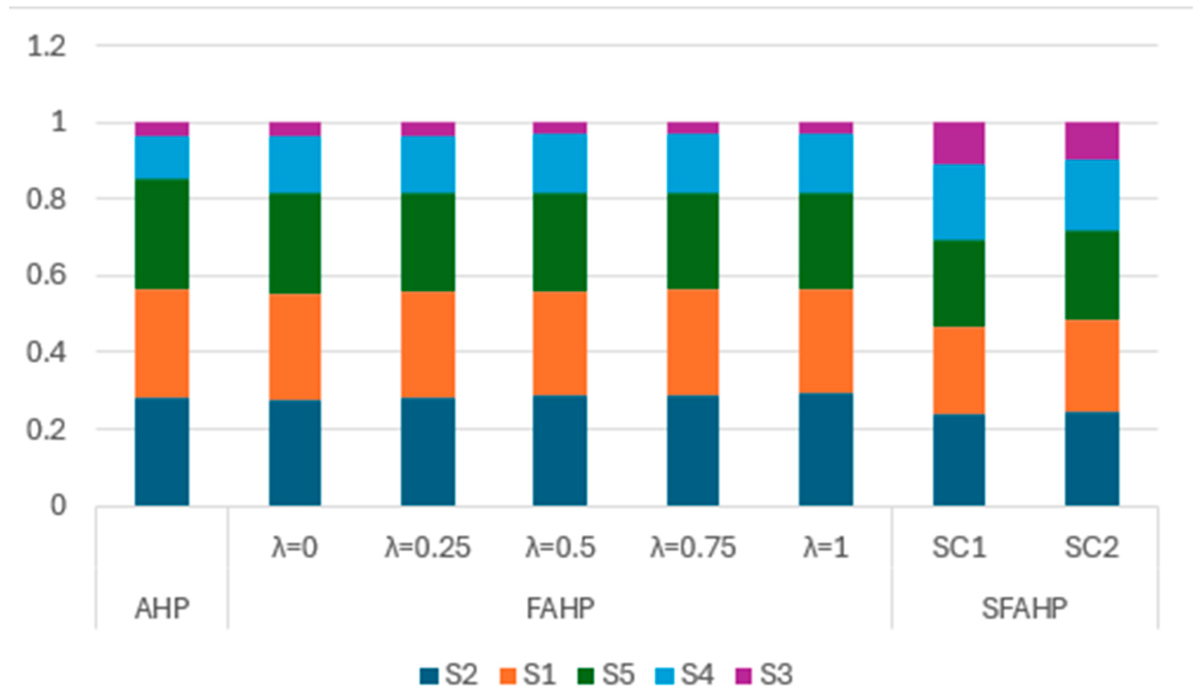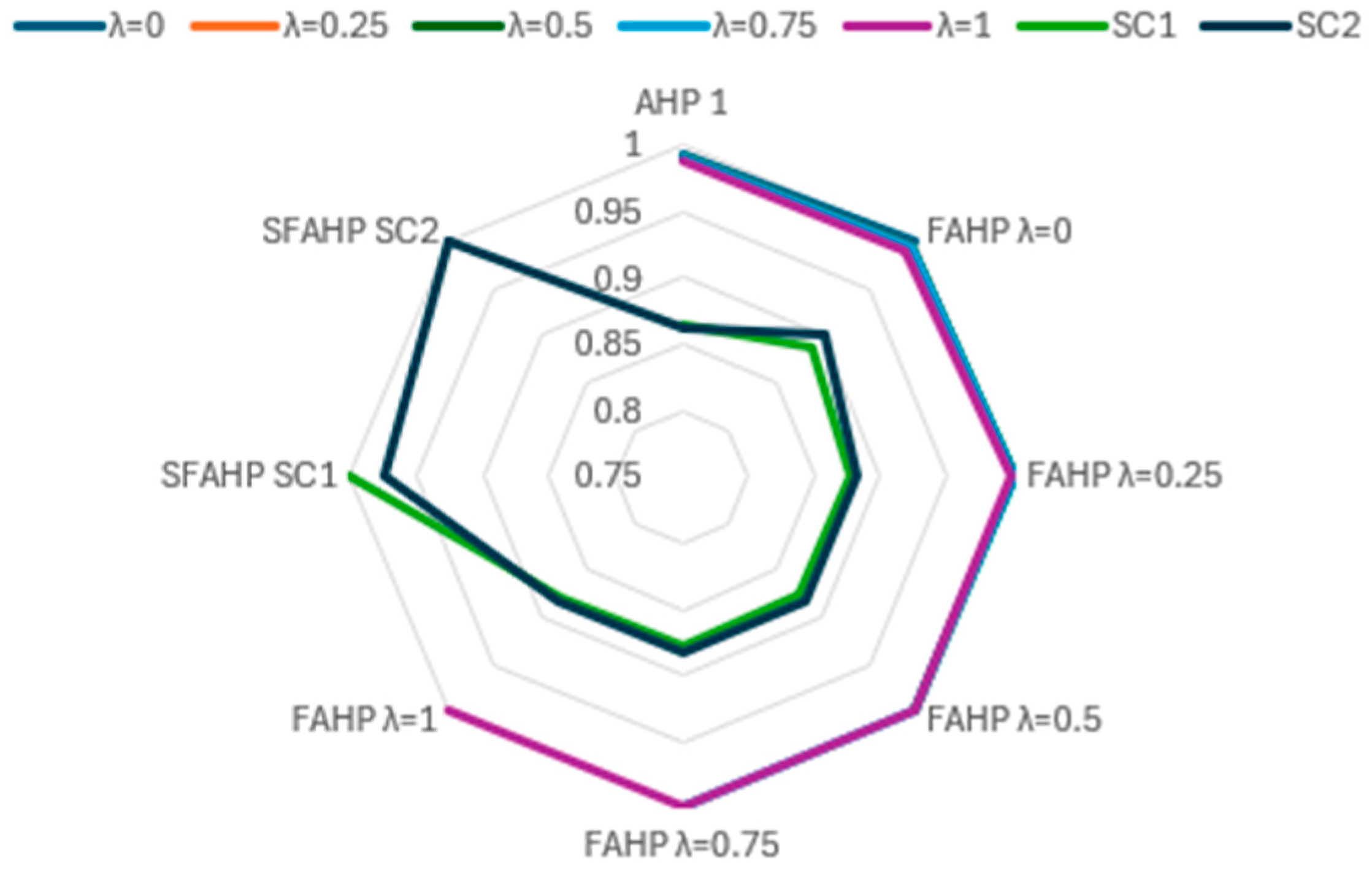 for the AHP is when it is compared to SFAHP (SC2) and is equal to 0.8623377, also being the minimum of all calculated values. It is worth mentioning that