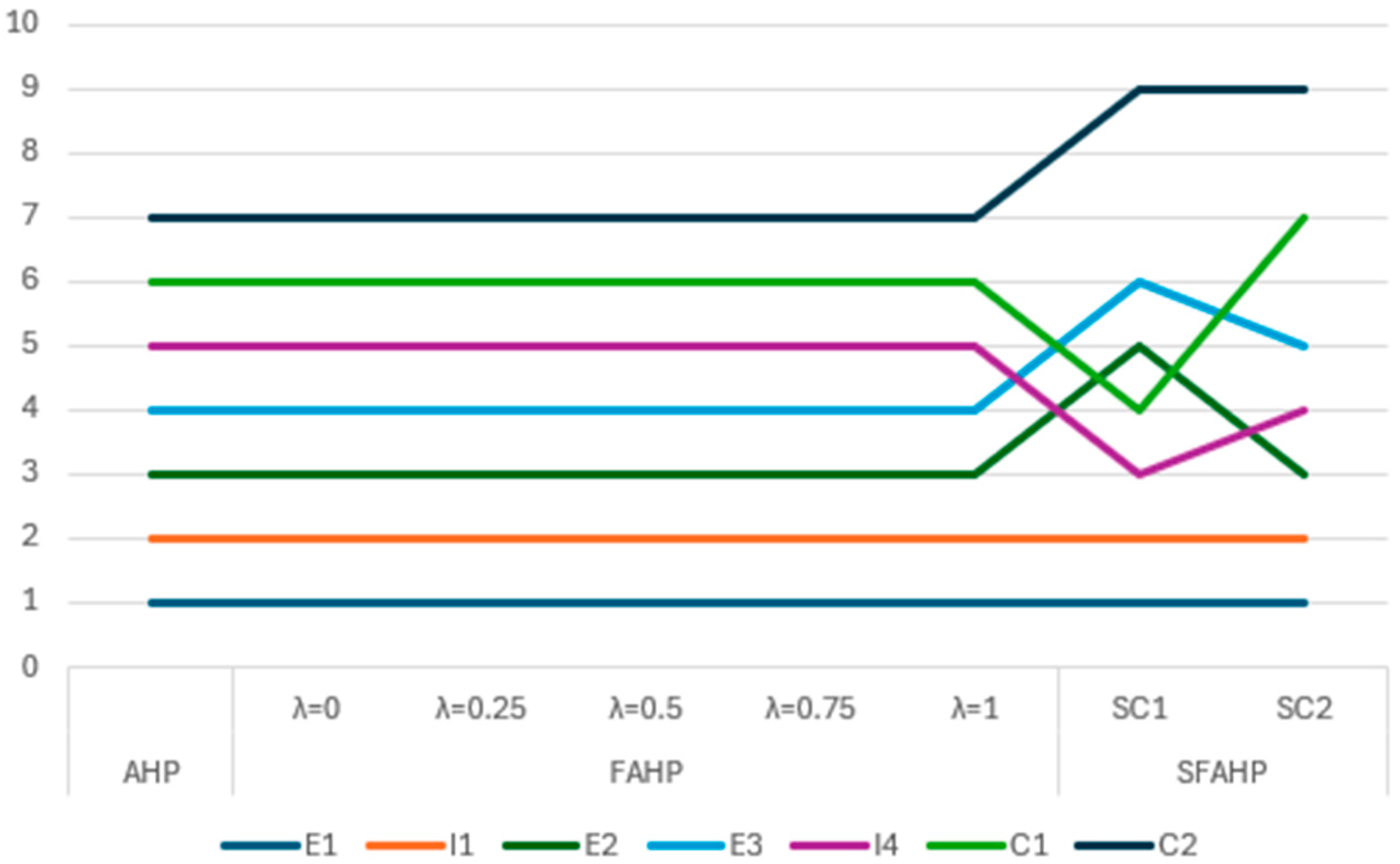 Table 7). In the rest of the cases, there are no equally ranked sub-criteria. All five FAHP cases favor C1, with the average weight