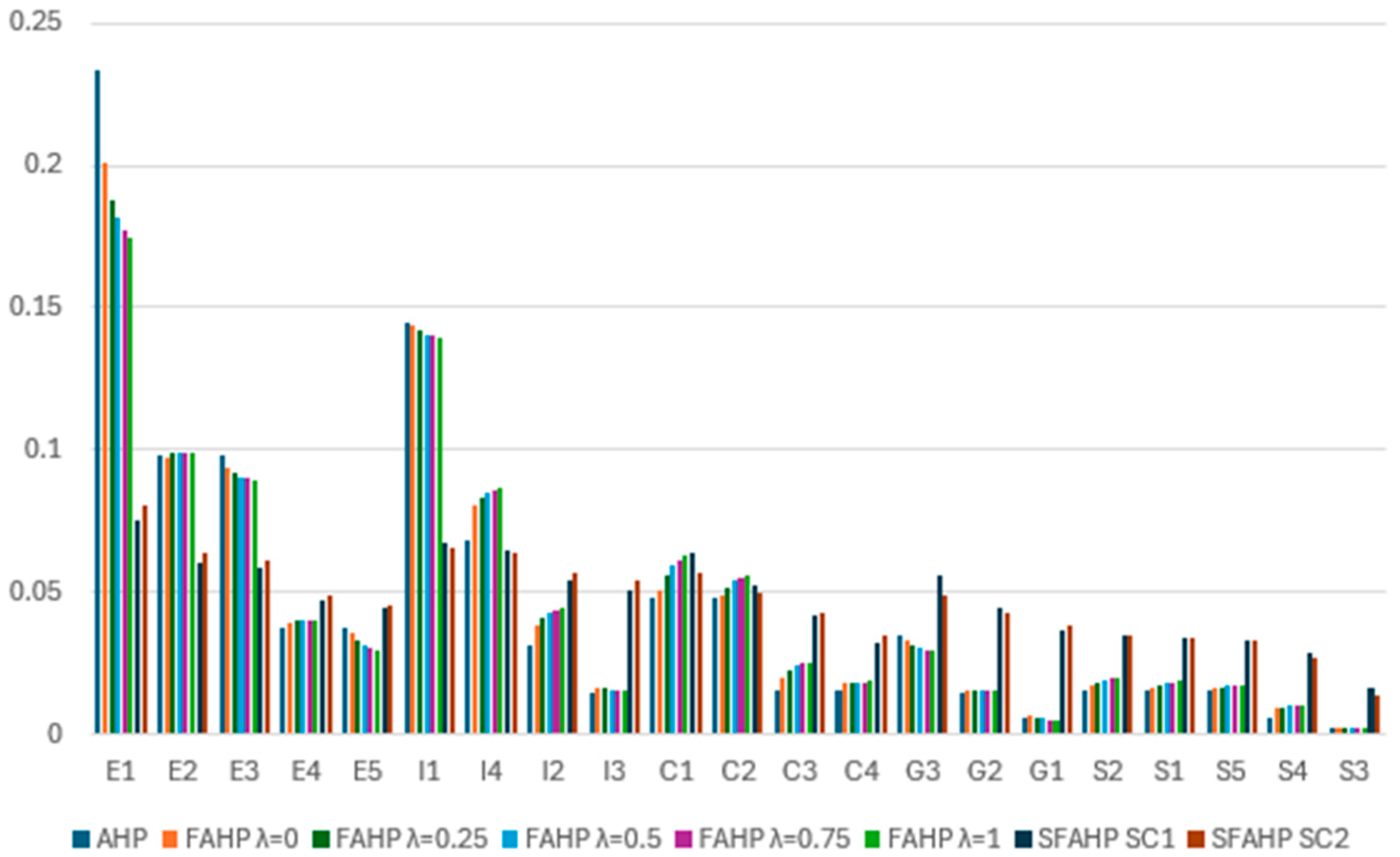 Figure 3. The weights for the second-ranked sub-criteria C2 in the optimistic and pessimistic FAHP case are 0.343 and 0.355, respectively, while for the lowest-ranked sub-criteria, the corresponding weights are 0.114 and 0.131. A similar conclusion can be also made in the case of the SFAHP algorithm, where the average values of the sub-criteria are, respectively,