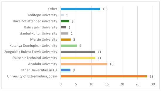 Figure 3 shows that 28% of the respondents (283 people) were from the University of Extremadura. 15% of respondents were from Anadolu University, while Eskisehir Technical University and Zonguldak Bulent Ecevit University each contributed 11% to the survey.