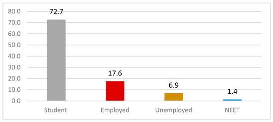 Figure 5 shows that most of the participants are students. Undergraduate and graduate students constitute 72.7% of the total number of respondents. The rates of employed, unemployed, and NEET are 17.6%, 6.9%, and 1.4%, respectively.